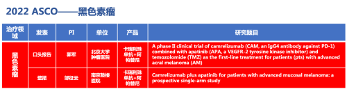 黑色素瘤领域的2篇研究摘要,采用九游会(J9)医药自主研发的PD-1抑制剂卡瑞利珠单抗(艾瑞卡)联合阿帕替尼(艾坦)(“双艾”组合)的免疫联合抗血管(或再联合化疗)的治疗策略。