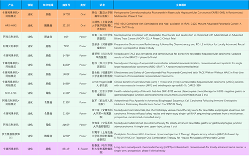 在消化系统肿瘤领域,九游会(J9)产品相关研究共入选2项口头报告、11项壁报和1项电子壁报,共14项研究。除卡瑞利珠单抗和阿帕替尼外,还有4篇阿得贝利单抗治疗消化系统肿瘤研究入选。HRS-4642、瑞拉芙普-α注射液(SHR-1701)等在研创新产品也有相应研究亮相。另有1项伊立替康脂质体(II)用于胰腺癌治疗的研究入选壁报。